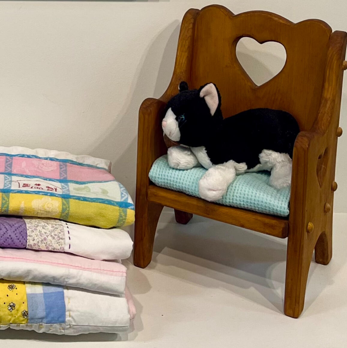 Sound holder (multiple), 2022, quilted bag with handle, found objects, 10" x 10" x 10" (each)
