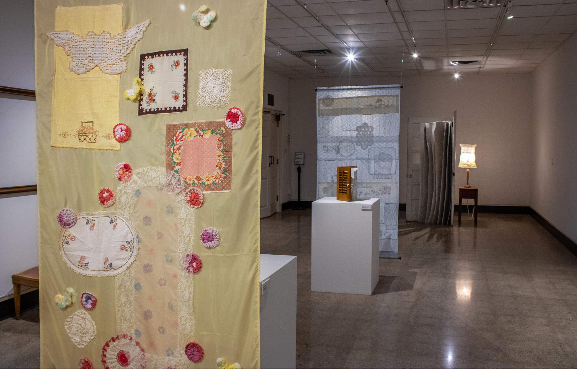 Butterfly, 2004-2023, embroidery and quilting on fabric; Cupholder, 2021, crocheted thread, glass votive; Stars Quilt, 2023—, unfinished hand-stitched quilt