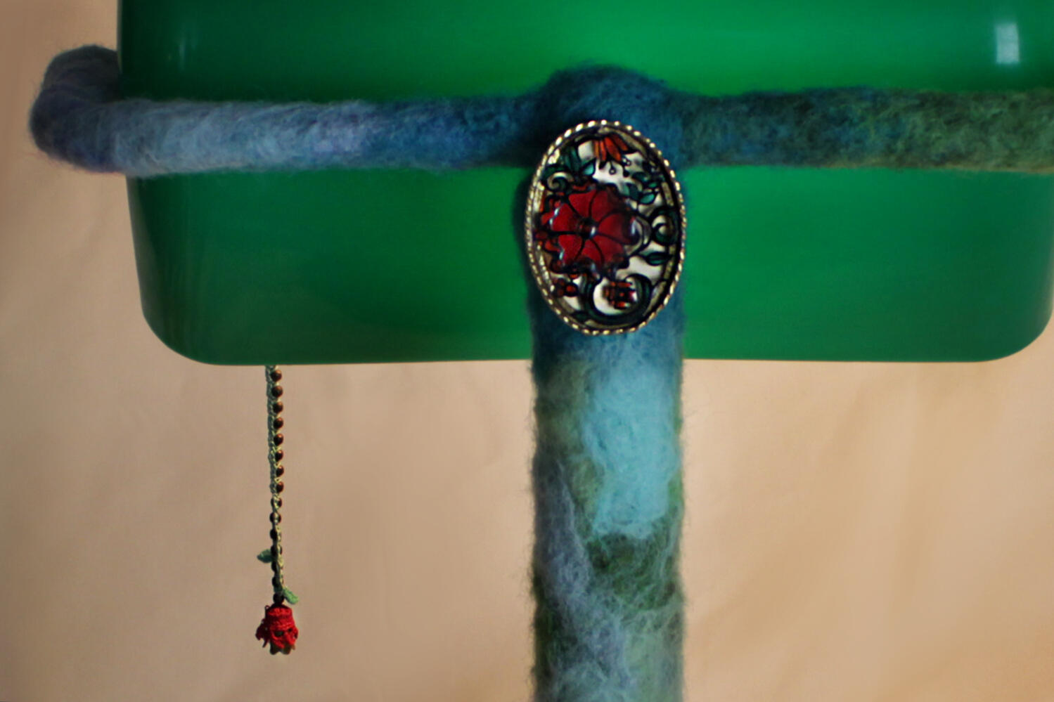 Soft Light #2, 2022, needle felted wool, lamp, crochet-covered pull-cord and cord, vintage brooch, 6" x 10" x 14"