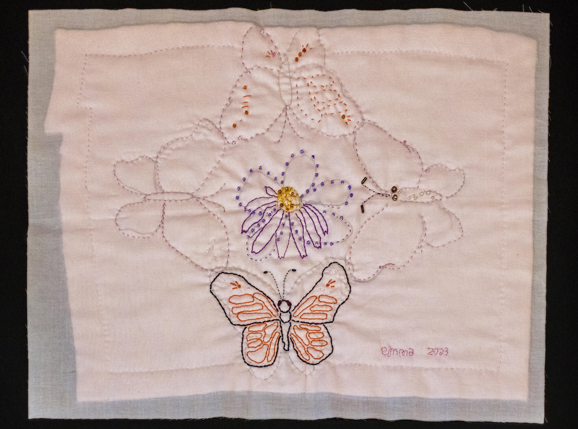 Butterflies, 2004-2023, embroidery with beads on fabric; Doors Quilt, 2023, hand-stitched quilt
