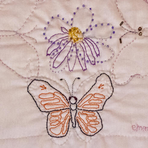 Butterflies, 2004-2023, embroidery with beads on fabric; Doors Quilt, 2023, hand-stitched quilt
